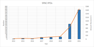 Despite the popularity and growth in the number of SPACs, academic analysis shows investor returns on SPAC companies post-merger are almost uniformly negative, although investors in SPACs and merged companies with may earn excess returns immediately after the merger.[6] Proliferation of SPACs usually accelerates around periods of economic bubbles, such as the "everything bubble" between 2020 and 2021.[7]