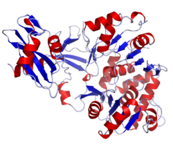 Instead of a luciferase, the jellyfish Aequorea victoria makes use of another type of protein called a photoprotein, in this case specifically aequorin.[35] When calcium ions are added, rapid catalysis creates a brief flash quite unlike the prolonged glow produced by luciferase. In a second, much slower step, luciferin is regenerated from the oxidized (oxyluciferin) form, allowing it to recombine with aequorin, in preparation for a subsequent flash. Photoproteins are thus enzymes, but with unusual reaction kinetics.[36] Furthermore, some of the blue light released by aequorin in contact with calcium ions is absorbed by a green fluorescent protein, which in turn releases green light in a process called resonant energy transfer.[37]
