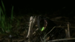 Fireflies use light to attract mates. Two systems are involved according to species; in one, females emit light from their abdomens to attract males; in the other, flying males emit signals to which the sometimes sedentary females respond.[48][53] Click beetles emit an orange light from the abdomen when flying and a green light from the thorax when they are disturbed or moving about on the ground. The former is probably a sexual attractant but the latter may be defensive.[48] Larvae of the click beetle Pyrophorus nyctophanus live in the surface layers of termite mounds in Brazil. They light up the mounds by emitting a bright greenish glow which attracts the flying insects on which they feed.[48]
