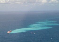 On 3 April 2010, the Chinese ship Shen Neng 1 carrying 950 tonnes of oil, ran aground east of Rockhampton in Central Queensland, Australia,[72] causing the 2010 Great Barrier Reef oil spill and inflicting the largest damage to the GBR and the Coral Sea so far.[73] The scarred area was roughly 3 km (1.9 mi) long and 250 m (820 ft) wide,[74] and some parts of it have become completely devoid of marine life. There are concerns that there could be considerable long-term damage and it will take 10 to 20 years for the reef to recover.[75] By 13 April 2010, oil tar balls were washing up on the beaches of North West Island, a significant bird rookery and turtle nesting colony.[73]