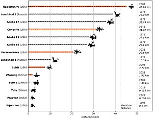 In December 2019, Yutu 2 broke the lunar longevity record, previously held by the Soviet Union's Lunokhod 1 rover,[47] which operated on the lunar surface for eleven lunar days (321 Earth days) and traversed a total distance of 10.54 km (6.55 mi).[48]