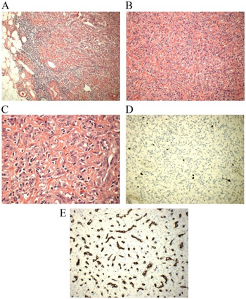 Histopathological microscopic analyses of hematoxylin and eosin-stained AFST tissues generally reveal bland appearing spindle-shaped cells and a prominent small, thin-walled blood vessels network in a background of alternating myxoid connective tissue areas and more highly cellular collagen fiber-rich connective tissue areas. (Myxoid indicates areas that appear more blue or purple than normal due to their high uptake of the hematoxylin stain.) Typically, these tumors appear well-circumscribed but some cases show them infiltrating into adjacent normal adipose tissues, connective tissues, skeletal muscles, and/or joints.[4] Immunohistochemistry analyses (i.e. identifying specific proteins in cells using antibodies that bind to these proteins) of AFST tissues detect cells bearing estrogen receptor, CD163 and NCOA2 proteins in 100% of cases; MUC1 (also termed EMA) protein in 46% of cases; desmin protein in 22% of cases; ACTA2 (also termed α-SMA), CD34, and STAT6 proteins in 10% or fewer cases, and S100 and cytokeratin proteins in no cases.
