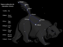 One tradition, based on the birth years in the Chinese calendar, concerns the link between Mongolian people and the Great Bear as one star of this constellation is attributed to each of them. Chinese and Mongolian calendars have some similarities (the Mongolian calendar is a lunar calendar). Each year is symbolized by an animal, itself associated to a star of the constellation Great Bear. The first, Dubhe, corresponds to the Rat's year, the second, Merak, corresponds to the Ox and so on until the end of the Great Bear's tail where Alkaid symbolizes the year of the Horse. Then we come back to the first, the Goat year and we repeat the same way until the twelfth and latest year of the Chinese calendar, the one of the Pig. Therefore, the two stars at the end of the tail are assigned one time only.