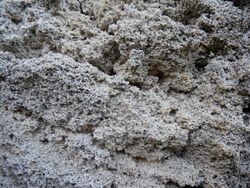 Rocks and land at the foot of these mountains is calcarenite, coral sand, blown inland during the Pleistocene between 130,000 and 20,000 years ago and cemented into stratified layers by water percolation.[133] In this rock are fossils of bird bones and eggs, land and marine snails, and the extinct giant horned turtle (Meiolania platyceps) which is not closely related to any living kind of turtle. The crescent of the island protects a coral reef and lagoon; the barrier reef, at 31°30'S, is the most southerly in the world.[134] Beach sands, rather than consisting of quartz grains derived from granite, as on the mainland, are made of fragments of shell, coral, and coralline algae, together with basalt grains, and basaltic minerals such as black diopside and green olivine.[122] The lowland consists of alluvial soils.