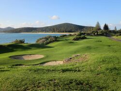 As distances to sites of interest are short, cycling is the main means of transport on the island. Tourist activities include golf (9-hole), lawn bowls, tennis, fishing (including deep-sea game fishing), yachting, windsurfing, kitesurfing, kayaking, and boat trips (including glass-bottom tours of the lagoon).[111][112] Swimming, snorkelling, and scuba diving are also popular in the lagoon, as well as off Tenth of June Island, a small rocky outcrop in the Admiralty group where an underwater plateau drops 36 m (118 ft) to reveal extensive gorgonia and black corals growing on the vertical walls. Other diving sites are found off Ball's Pyramid, 26 km (16 mi) away, where trenches, caves, and volcanic drop-offs occur.[113]