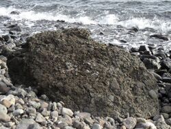 Two periods of volcanic activity produced the major features of the island. The first about 6.9 million years (Mya) ago produced the northern and central hills, while the younger and highly eroded Mount Gower and Mount Lidgbird were produced about 6.3 Mya by successive basalt (an extrusive igneous rock) lava flows that once filled a large volcanic caldera (crater)[129] and can now be seen as horizontal basalt strata on mountain cliffs (at Malabar and Mount Gower) occasionally interspersed with dikes (vertical lava intrusions).[130][131] Geological pyroclastic remnants of a volcanic eruption can be seen on the 15 ha (37-acre) Roach Island (where the oldest rocks occur) and Boat Harbour as tuff (ash), breccia (with angular blocks), and agglomerate (rounded 'bombs').[14] Offshore on the Lord Howe Rise, water depths reach 2,000 m (6,600 ft) falling to 4,000 m (13,000 ft) to the west of the rise. From the dimensions of the rock on which the island stands, the island has been calculated to erode to 1/40th of its original size.[132]