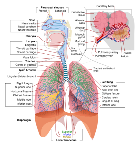 The upper respiratory tract is considered the airway above the glottis or vocal cords; sometimes, it is taken as the tract above the cricoid cartilage. This part of the tract includes the nose, sinuses, pharynx, and larynx.[2]