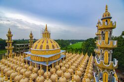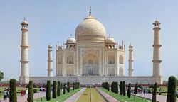 Bulbous domes bulge out beyond their base diameters, offering a profile greater than a hemisphere.[3] An onion dome is a greater than hemispherical dome with a pointed top in an ogee profile.[3] They are found in the Near East, Middle East, Persia, and India and may not have had a single point of origin. Their appearance in northern Russian architecture predates the Tatar occupation of Russia and so is not easily explained as the result of that influence.[75] They became popular in the second half of the 15th century in the Low Countries of Northern Europe, possibly inspired by the finials of minarets in Egypt and Syria, and developed in the 16th and 17th centuries in the Netherlands before spreading to Germany, becoming a popular element of the baroque architecture of Central Europe. German bulbous domes were also influenced by Russian and Eastern European domes.[76] The examples found in various European architectural styles are typically wooden.[3] Examples include Kazan Church in Kolomenskoye and the Brighton Pavilion by John Nash.[3] In Islamic architecture, they are typically made of masonry, rather than timber, with the thick and heavy bulging portion serving to buttress against the tendency of masonry domes to spread at their bases. The Taj Mahal is a famous example.[3]