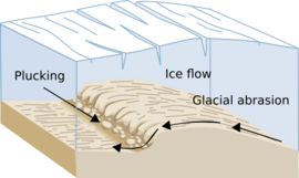 In northeastern Minnesota, the glaciers were thousands of feet thick. As the glaciers moved through the area they eroded large quantities of rock away. Ice itself is not very abrasive, but by picking up and moving pieces of rock it was able to scrape away softer underlying materials. Volcanic rocks underlie the area. Along the Rove region of the Arrowhead Region, there are multiple tilted layers of volcanic rocks interspersed with layers of shale; the shalelayers are softer than the volcanic basalt. As the glaciers eroded the materials, the shales were removed. The topography in the Rove region alternates hills (composed of diabase) and valleys (former shale layers); these hills and valley orient in a west to east direction. Many of these valleys are now lakes. Because the lakes are oriented west-east, visitors to the Rove region think that the ice moved in an east-west direction. Glacial striations (scratches) show that the ice moved from north-to-south, perpendicular to the orientation of the lakebeds themselves.
