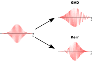Coming back to the first picture, we see that the two effects introduce a change in frequency in two different opposite directions. It is possible to make a pulse so that the two effects will balance each other. Considering higher frequencies, linear dispersion will tend to let them propagate faster, while nonlinear Kerr effect will slow them down. The overall effect will be that the pulse does not change while propagating: such pulses are called temporal solitons.