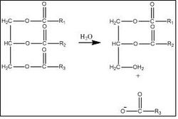 Neutral lipids are hydrolyzed by lipases shortly after death, to free the fatty acids from their glycerol backbone. This creates a mixture of saturated and unsaturated fatty acids.[13] Under the right conditions (when sufficient water and bacterial enzymes are present), neutral lipids will be completely degraded until they are reduced to fatty acids. Under suitable conditions, the fatty acids can be transformed into adipocere.[12] In contrast, fatty acids may react with sodium and potassium ions present in tissue, to produce salts of fatty acids. When the body is located near soil, the sodium and potassium ions can be replaced by calcium and magnesium ions to form soaps of saturated fatty acids, which can also contribute to the formation of adipocere.[4]