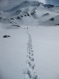 The summer climbing season runs from late April until October, although many attempts are made in the winter.[4] In winter, Sargents Ridge and Casaval Ridge, to the east and west of Avalanche Gulch,[38] respectively, become the most traveled routes, to avoid avalanche danger. Mount Shasta is also a popular destination for backcountry skiing. Many of the climbing routes can be descended by experienced skiers, and there are numerous lower-angled areas around the base of the mountain.[4]