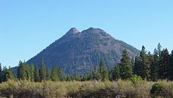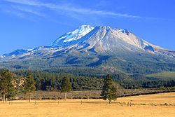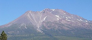 Mount Shasta (/ˈʃæstə/ SHASS-tə; Shasta: Waka-nunee-Tuki-wuki;[5] Karuk: Úytaahkoo)[6][lower-alpha 1] is a potentially active[7] volcano at the southern end of the Cascade Range in Siskiyou County, California. At an elevation of 14,179 feet (4,321.8 meters), it is the second-highest peak in the Cascades and the fifth-highest in the state. Mount Shasta has an estimated volume of 85 cubic miles (350 cubic kilometers), which makes it the most voluminous stratovolcano in the Cascade Volcanic Arc.[8][9] The mountain and surrounding area are part of the Shasta–Trinity National Forest.