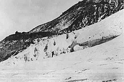 By the 1860s and 1870s, Mount Shasta was the subject of scientific and literary interest. In 1854 John Rollin Ridge titled a poem "Mount Shasta." A book by California pioneer and entrepreneur James Hutchings, titled Scenes of Wonder and Curiosity in California, contained an account of an early summit trip in 1855.[21] The summit was achieved (or nearly so) by John Muir, Josiah Whitney, Clarence King, and John Wesley Powell. In 1877, Muir wrote a dramatic popular article about his surviving an overnight blizzard on Mount Shasta by lying in the hot sulfur springs near the summit.[22] This experience was inspiration to Kim Stanley Robinson's short story "Muir on Shasta".
