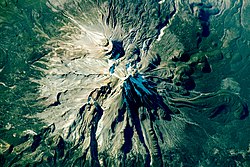 Aerial view of Mount Shasta from the southwest, with Sun low in the west | |