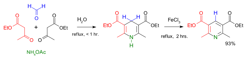 The first major synthesis of pyridine derivatives was described in 1881 by Arthur Rudolf Hantzsch.[42] The Hantzsch pyridine synthesis typically uses a 2:1:1 mixture of a β-keto acid (often acetoacetate), an aldehyde (often formaldehyde), and ammonia or its salt as the nitrogen donor. First, a double hydrogenated pyridine is obtained, which is then oxidized to the corresponding pyridine derivative. Emil Knoevenagel showed that asymmetrically-substituted pyridine derivatives can be produced with this process.[43]