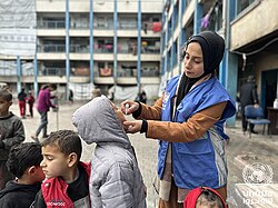 In 2022, prior to the Israel-Hamas conflict, routine immunization coverage of eligible children exceeded 99%, but fell to less than 90% by the first quarter of 2024, according to the WHO.[143] In 2024, the Gaza Health Ministry reported that several children have shown symptoms consistent with polio, with laboratory tests confirming that a 10-month-old child is infected with the virus.[144] United Nations Secretary-General António Guterres urged for a weeklong cease-fire in Gaza to facilitate vaccinations and prevent a potential polio outbreak, emphasizing the risk faced by many children.[145]