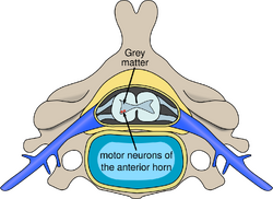 Spinal polio, the most common form of paralytic poliomyelitis, results from viral invasion of the motor neurons of the anterior horn cells, or the ventral (front) grey matter section in the spinal column, which are responsible for movement of the muscles, including those of the trunk, limbs, and the intercostal muscles.[18] Virus invasion causes inflammation of the nerve cells, leading to damage or destruction of motor neuron ganglia. When spinal neurons die, Wallerian degeneration takes place, leading to weakness of those muscles formerly innervated by the now-dead neurons.[47] With the destruction of nerve cells, the muscles no longer receive signals from the brain or spinal cord; without nerve stimulation, the muscles atrophy, becoming weak, floppy and poorly controlled, and finally completely paralyzed.[18] Maximum paralysis progresses rapidly (two to four days), and usually involves fever and muscle pain. Deep tendon reflexes are also affected, and are typically absent or diminished; sensation (the ability to feel) in the paralyzed limbs, however, is not affected.[48]