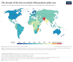 Africa was declared free of wild polio in August 2020, although cases of circulating vaccine-derived poliovirus type 2 continue to appear in several countries.[152]