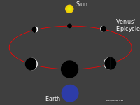 The first observations of the full planetary phases of Venus were by Galileo at the end of 1610 (though not published until 1613 in the Letters on Sunspots). Using a telescope, Galileo was able to observe Venus going through a full set of phases, something prohibited by the Ptolemaic system that assumed Venus to be a perfect celestial body. In the Ptolemaic system, the Sun and Venus circle the earth, with Venus orbiting around a point on the Earth-Sun axis, so that Venus is never on the far side of the sun. One could never expect an alignment Sun-Earth-Venus or Venus-Sun-Earth to occur, so that a full Venus could never be observed. Galileo's observations of the phases of Venus[4] essentially ruled out the Ptolemaic system, and was compatible only with the Copernican system and the Tychonic system and other models such as the Capellan and Riccioli's extended Capellan model.
