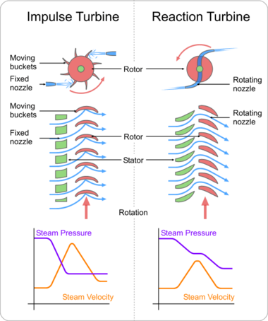 Schematic of impulse and reaction turbines, where the rotor is the rotating part, and the stator is the stationary part of the machine.