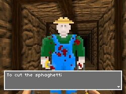 At the end of the cave, the player finds Julia. She tells the player that she came into the cave to end her life. Julia tells the player that her husband had found a golden nugget whilst mining in the cave, but buried the nugget and disappeared. Her son had come into the cave searching for his lost father, and also met the same fate. Julia asks the player assist her in ending her life. The player may choose to kill her, or refuse to do so and seek help. Regardless of the choice, the player will be covered in blood. Upon exiting the cave, players encounter a farmer, also carrying a lantern and a knife, who is the stand-in for the next player of the game. Players are required to input a response to the same three questions asked of the blood-stained farmer when they entered the game. The game then ends, with the player being told: It is up to the next player of this game to choose your fate. Just as you chose for the previous player. Players are invited to input their name and email address to receive the information on the outcome of the succeeding player's decision to kill or spare them.[3]