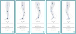 Classification of the gait pattern according to the Amsterdam Gait Classification: In gait type 1, the knee angle is normal and the foot contact is complete. In gait type 2, the knee angle is hyperextended and the foot contact is complete. In gait type 3, the knee angle is hyperextended and foot contact is incomplete (only on the forefoot). In gait type 4, the knee angle is bent and foot contact is incomplete (only on the forefoot). With gait type 5, the knee angle is bent and the foot contact is complete.[127]