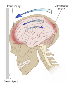 Damage may occur directly under the site of impact, or it may occur on the side opposite the impact (coup and contrecoup injury, respectively).[66] When a moving object impacts the stationary head, coup injuries are typical,[68] while contrecoup injuries are usually produced when the moving head strikes a stationary object.[69]