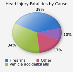 Biological, clinical, and demographic factors contribute to the likelihood that an injury will be fatal.[165] In addition, outcome depends heavily on the cause of head injury. In the US, patients with fall-related TBIs have an 89% survival rate, while only 9% of patients with firearm-related TBIs survive.[170] In the US, firearms are the most common cause of fatal TBI, followed by vehicle accidents and then falls.[165] Of deaths from firearms, 75% are considered to be suicides.[165]