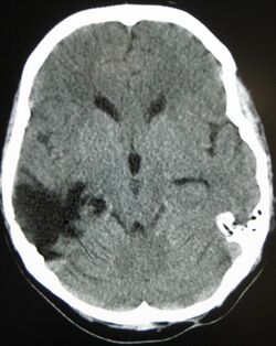 | CT scan showing cerebral contusions, hemorrhage within the hemispheres, and subdural hematoma. There is also displaced skull fracture of left transverse parietal and temporal bones.[2] | |