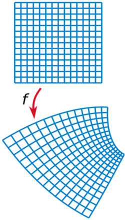 is called conformal (or angle-preserving) at a point [math]\displaystyle{ u_0 }[/math] if it preserves oriented angles between curves through [math]\displaystyle{ u_0 }[/math] with respect to their orientation (i.e., not just the magnitude of the angle). Conformal maps preserve both angles and the shapes of infinitesimally small figures, but not necessarily their size or curvature.