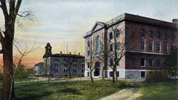 "Old Main" was the first building erected at Gustavus Adolphus College. Its cornerstone was laid on August 12, 1875.[29] Contracted to O. N. Ostrom and constructed from Kasota limestone, the total cost of the building was estimated at $25,000.[29] Old Main was completed in 1876 and dedicated on October 31 of that year. Originally called the School Building, as more buildings were erected it became known as the Main Building and by 1905 as Old Main.[29]