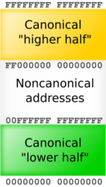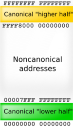 In addition, the AMD specification requires that the most significant 16 bits of any virtual address, bits 48 through 63, must be copies of bit 47 (in a manner akin to sign extension). If this requirement is not met, the processor will raise an exception.[11](p131) Addresses complying with this rule are referred to as "canonical form."[11](p130) Canonical form addresses run from 0 through 00007FFF'FFFFFFFF, and from FFFF8000'00000000 through FFFFFFFF'FFFFFFFF, for a total of 256 TB of usable virtual address space. This is still 65,536 times larger than the virtual 4 GB address space of 32-bit machines.