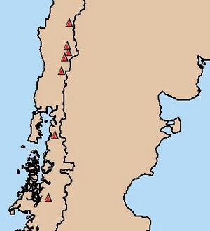 Romeral in Colombia is the northernmost active member of the Andean Volcanic Belt.[1] South of latitude 49° S within the Austral Volcanic Zone volcanic activity decreases with the southernmost volcano Fueguino in Tierra del Fuego archipelago.