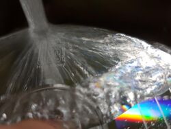 Most optical discs exhibit a characteristic iridescence as a result of the diffraction grating formed by their grooves.[1][2] This side of the disc contains the actual data and is typically coated with a transparent material, usually lacquer.