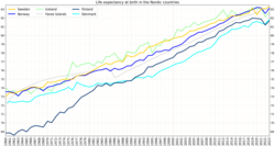 Life expectancy is rising in all the Nordic countries, though the levels vary greatly. Life expectancy for men in Greenland is 68.3 years (2011), compared to 80.8 years for men in Iceland. Women in the Faroe Islands and in Åland are expected to live the longest – more than 84 years. The population in the Nordic countries is getting older and according to the population projection for the Nordic countries as a whole, the share of the population above the age of 80 will reach 8.4 per cent in 2040, as compared to the 2013 level of 4.7 per cent. The share of population 80 years or older has increased from 1990 to 2013. The increase in the share of people above the age of 80 over the last 10 years is partly due to the fact that the death rate has fallen for almost all age groups and partly that the number of births has been low during the same period. In the next 25 years, the demographic dependency ratio is expected to have the strongest growth in Finland and Åland. According to the most recent population forecasts in Finland and Åland, in 2030 it is expected that people over 65 will make up 50 per cent of the adult population. Sweden and Denmark can look forward to a relatively modest increase in the next decades. Iceland and Norway seem to maintain their positions with the lowest proportions of elderly people in the Nordic countries.[127]