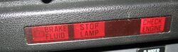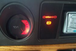 Many vehicles have a red tell-tale to indicate that the parking brake is engaged or that there is a fault with the vehicle's braking system.[7] This tell-tale in most cases bears the ISO symbols for a parking brake and for a braking system emergency. In the past, US regulations required this tell-tale to bear the legend brake.[10]