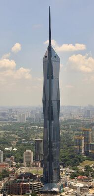 Independence coupled with rapid economic growth from the 1970s to the 1990s and with Islam being the official religion in the country, has resulted in the construction of buildings with a more local and Islamic flavour arise around the city. Many of these buildings derive their design from traditional Malay items such as the songkok and the keris. Some of these buildings have Islamic geometric motifs integrated into the designs of the building, due to Islamic restrictions on imitating nature through drawings.[143] Examples of these buildings are Telekom Tower, Maybank Tower, Dayabumi Complex, and the Islamic Centre.[144] Some buildings such as the Islamic Arts Museum Malaysia and National Planetarium have been built to masquerade as a place of worship, complete with dome and minaret, when in fact they are places of science and knowledge. The 452-metre (1,483 ft) Petronas Towers are the tallest twin buildings in the world and were the tallest buildings in the country until being surpassed by The Exchange 106 by 1.7 meters in 2019.[145] They were designed to resemble motifs found in Islamic art.[146]