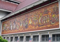 Kuala Lumpur is a hub for cultural activities and events in Malaysia. Among the centres is the National Museum, which is situated along the Mahameru Highway. Its collection comprises artefacts and paintings collected throughout the country.[157] The Islamic Arts Museum, which houses more than seven thousand Islamic artefacts including rare exhibits and a library of Islamic art books, is the largest Islamic arts collection in Southeast Asia.[158] The museum's collection not only concentrates on works from the Middle East, but also includes work from elsewhere in Asia, such as China and Southeast Asia. Kuala Lumpur has a craft complex coupled with a museum that displays a variety of textile, ceramic, metal craft and weaved products. Information on the production process is portrayed in diorama format complete with historical facts, technique and traditionally engineered equipment. Among the processes shown are pottery making, intricate wood carving, silver-smithing, weaving songket cloth, stamping batik patterns on cloth, and boat-making.[159]