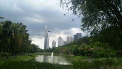 Floods are frequent in Kuala Lumpur after heavy downpours, especially in the city centre, because irrigation structure lags behind the intense development in the city.[85] Smoke from forest fires in nearby Sumatra and Kalimantan sometimes casts a haze over the region, and is a major source of pollution, along with open burning, motor vehicle emissions, and construction.[86]