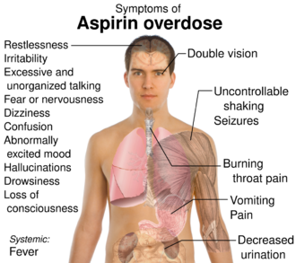Salicylate poisoning, also known as aspirin poisoning, is the acute or chronic poisoning with a salicylate such as aspirin.[1] The classic symptoms are ringing in the ears, nausea, abdominal pain, and a fast breathing rate.[1] Early on, these may be subtle, while larger doses may result in fever.[1][4] Complications can include swelling of the brain or lungs, seizures, low blood sugar, or cardiac arrest.[1]