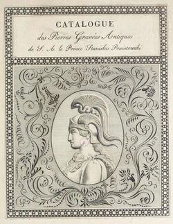 Poniatowski was "an avid collector of art, ... once considered the richest man in Europe".[2] He inherited approximately 154 antique gems from his uncle, King Stanisław August Poniatowski of Poland, who died in 1798.[3] He augmented this collection with over 2,600[4] forgeries by contemporary carvers, in a florid classicizing style and in most cases signed with ancient names,[2][3][5] while claiming publicly that the works were genuine antiquities.[5] The gems depict scenes from mythology, including the works of Homer, Virgil, and Ovid; some scenes of historical events; and portraits of a wide variety of ancient Greek and Roman figures.[4] Poniatowski published a catalog of this work c. 1830 with further information in two following volumes (Poniatowski c. 1830, 1832, 1833).