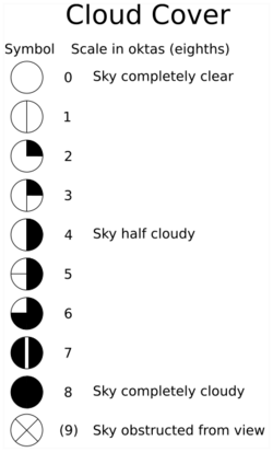 In meteorology, an okta is a unit of measurement used to describe the amount of cloud cover at any given location such as a weather station. Sky conditions are estimated in terms of how many eighths of the sky are covered in cloud, ranging from 0 oktas (completely clear sky) through to 8 oktas (completely overcast). In addition, in the SYNOP code there is an extra cloud cover indicator '9' indicating that the sky is totally obscured (i.e. hidden from view), usually due to dense fog or heavy snow.[1]