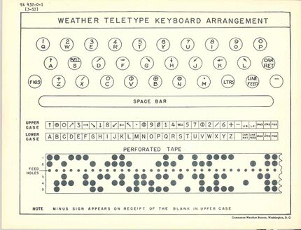 In the early 20th century, it was common for weather maps to be hand drawn. The symbols for cloud cover on these maps, like the modern symbols, were drawn inside the circle marking the position of the weather station making the measurements. Unlike the modern symbols, these ones consisted of straight lines only rather than filled in blocks which would have been less practical on a hand drawing. A reduced set of these symbols were used on teleprinters used for distributing weather information and warnings. These machines were 5-bit teleprinters using a modified version of the Baudot-Murray code.[7]
