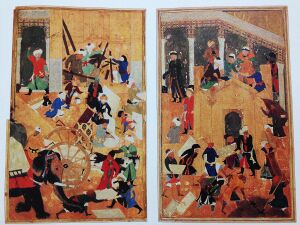 The most striking monument of the Qarakhanid era in Samarqand was the palace of Ibrahim ibn Hussein (1178–1202), which was built in the citadel in the 12th century. During the excavations, fragments of monumental painting were discovered. On the eastern wall, a Turkic warrior was depicted, dressed in a yellow caftan and holding a bow. Horses, hunting dogs, birds and periodlike women were also depicted here.[43]