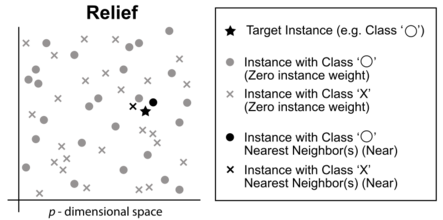 From Handwiki Relief is an algorithm developed by Kira and Rendell in 1992 that takes a filter-method approach to feature selection that is notably sensitive to feature interactions.[1][2] It was originally designed for application to binary classification problems with discrete or numerical features. Relief calculates a feature score for each feature which can then be applied to rank and select top scoring features for feature selection. Alternatively, these scores may be applied as feature weights to guide downstream modeling. Relief feature scoring is based on the identification of feature value differences between nearest neighbor instance pairs. If a feature value difference is observed in a neighboring instance pair with the same class (a 'hit'), the feature score decreases. Alternatively, if a feature value difference is observed in a neighboring instance pair with different class values (a 'miss'), the feature score increases. The original Relief algorithm has since inspired a family of Relief-based feature selection algorithms (RBAs), including the ReliefF[3] algorithm. Beyond the original Relief algorithm, RBAs have been adapted to (1) perform more reliably in noisy problems,[4] (2) generalize to multi-class problems[4] (3) generalize to numerical outcome (i.e. regression) problems,[5] and (4) to make them robust to incomplete (i.e. missing) data.[4]