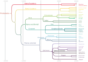 A language family is a group of languages related through descent from a common ancestral language or parental language, called the proto-language of that family. The term "family" reflects the tree model of language origination in historical linguistics, which makes use of a metaphor comparing languages to people in a biological family tree, or in a subsequent modification, to species in a phylogenetic tree of evolutionary taxonomy. Linguists therefore describe the daughter languages within a language family as being genetically related.[1] The divergence of a proto-language into daughter languages typically occurs through geographical separation, with different regional dialects of the proto-language spoken by different speech communities undergoing different language changes and thus becoming distinct languages from each other.[2]