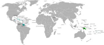 As of 2023, the United Nations Office of the High Representative for the Least Developed Countries, Landlocked Developing Countries and Small Island Developing States (UN-OHRLLS) lists 57 such nations (39 sovereign states and 18 dependent territories).[2] These nations are grouped into three geographical regions: the Caribbean;[3] the Pacific;[4] and Africa, Indian Ocean, Mediterranean and South China Sea (AIMS),[5] including 18 Associate Members of the United Nations Regional Commissions. Each of these regions has a regional cooperation body: the Caribbean Community, the Pacific Islands Forum, and the Indian Ocean Commission respectively, which many SIDS are members or associate members of. In addition, most (but not all) SIDS are members of the Alliance of Small Island States (AOSIS), which performs lobbying and negotiating functions for the SIDS within the United Nations System.