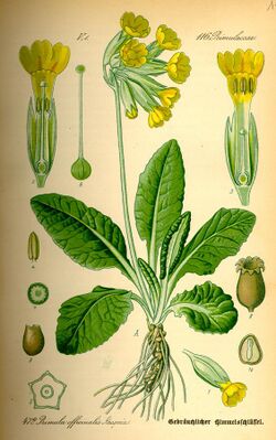 The Primulaceae are named for their nominative and type genus, Primula. Linnaeus used this name to reflect its place among the first flowers of spring, given the primrose's vernacular Latin name of primula veris (lit. little first of spring), primula (feminine diminutive primus, first + veris (genitive ver, spring).[11]