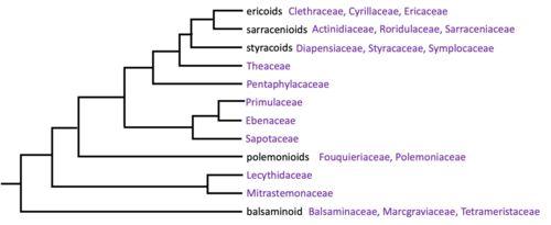 Primulaceae s.l. sensu APG III form part of the speciose (species rich) Asterid order Ericales s.l., with about 12,000 species and 22[lower-alpha 2] families as per APG IV. Ericales is one of four major clades within the asterids, where it is sister to the euasterids.[31] The phylogenetic structure of Ericales, as shown in the following cladogram, consists of seven major suprafamilial clades (e.g. balsaminoids, styracoids) and a group of "core" Ericales. Within the eracalean families, Primulaceae s.l. is shown as a sister group to Ebenaceae, and both are sister to Sapotaceae. These three families make up the primuloid clade.[30]